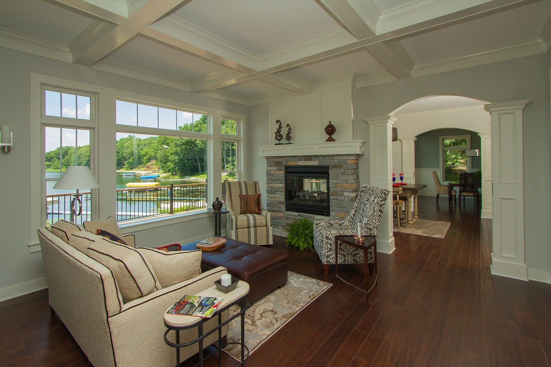 This is a 7000 square foot lakeside home that Jim Roberts Construction built with Eric Magnuson as the foreman of the project. It is a two-story home with a finished walkout basement. You will notice a high coffered ceiling in the main living area, which features a terrific view of the lake. The lake can also be seen from the dining area which has a fireplace and a door leading out to the deck. From the deck, an outdoor spiral staircase leads down to a patio with stamped concrete. You will also notice a large kitchen, complete with an island, and arched entryways throughout the home. For more information about how we can get started on building a similar custom lake home for you, please contact us and let us know about the project you have in mind.